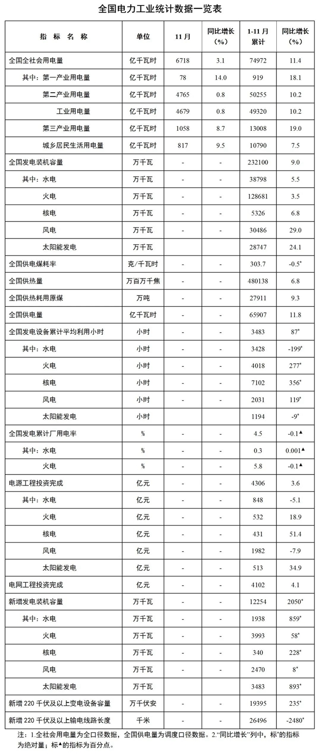 2021年12月17日,國家能源局發(fā)布1-11月份全國電力工業(yè)統(tǒng)計數(shù)據(jù)。截至11月底,全國發(fā)電裝機容量約23.2億千瓦,同比增長9.0%。其中,風(fēng)電裝機容量約3.0億千瓦,同比增長29%;太陽能發(fā)電裝機容量約2.9億千瓦,同比增長24.1%。 1-11月份,全國發(fā)電設(shè)備累計平均利用3483小時,比上...