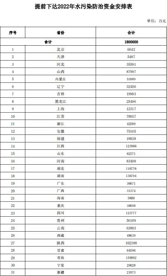 一年一度的水污染防治資金又來了。 2021年11月17日,財政部發(fā)布《關(guān)于提前下達(dá)2022年水污染防治資金預(yù)算的通知》,對2022年的水污染防治資金做了安排。2022年,全國水污染防治資金預(yù)算總計為180億,相比2021年的140億,增加了40億,增幅為28.57%。 在“提前下達(dá)202...