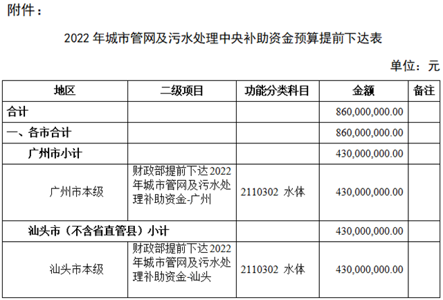 廣東省財(cái)政廳關(guān)于提前下達(dá)2022年中央城市管網(wǎng)及污水處理補(bǔ)助資金的通知粵財(cái)建〔2021〕54號(hào)廣州市、汕頭市財(cái)政局: 根據(jù)《財(cái)政部關(guān)于提前下達(dá)2022年城市管網(wǎng)及污水處理補(bǔ)助資金預(yù)算的通知》(財(cái)建〔2021〕338號(hào)),現(xiàn)將2022年中央城市管網(wǎng)及污水處理補(bǔ)助資金預(yù)算資金提前轉(zhuǎn)下達(dá)給你們(具體金額詳...
