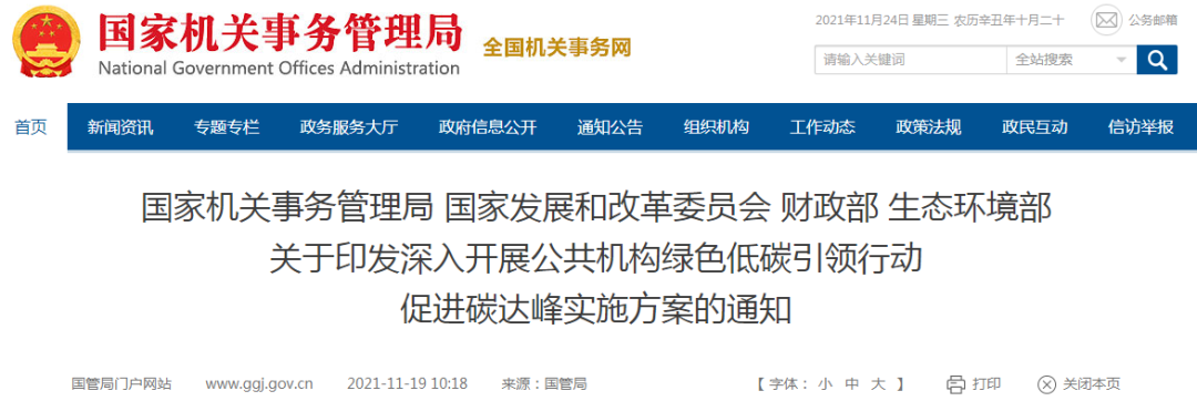 文章導(dǎo)讀11月19日,國(guó)家機(jī)關(guān)事務(wù)管理局、國(guó)家發(fā)展和改革委員會(huì)、財(cái)政部、生態(tài)環(huán)境部四部委發(fā)布《關(guān)于印發(fā)深入開展公共機(jī)構(gòu)綠色低碳引領(lǐng)行動(dòng)促進(jìn)碳達(dá)峰實(shí)施方案》的通知。11月19日,國(guó)家機(jī)關(guān)事務(wù)管理局、國(guó)家發(fā)展和改革委員會(huì)、財(cái)政部、生態(tài)環(huán)境部四部委發(fā)布《關(guān)于印發(fā)深入開展公共機(jī)構(gòu)綠色低碳引領(lǐng)行動(dòng)促進(jìn)碳達(dá)峰實(shí)...