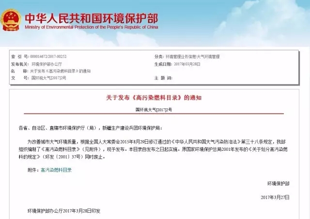 關(guān)于發(fā)布《高污染燃料目錄》的通知國(guó)環(huán)規(guī)大氣[2017]2號(hào)各省、自治區(qū)、直轄市環(huán)境保護(hù)廳(局),新疆生產(chǎn)建設(shè)兵團(tuán)環(huán)境保護(hù)局: 為改善城市大氣環(huán)境質(zhì)量,根據(jù)全國(guó)人大常委會(huì)2015年8月29日修訂通過(guò)的《中華人民共和國(guó)大氣污染防治法》第三十八條規(guī)定,我部組織編制了《高污染燃料目錄》(見(jiàn)附件),現(xiàn)予發(fā)布。...