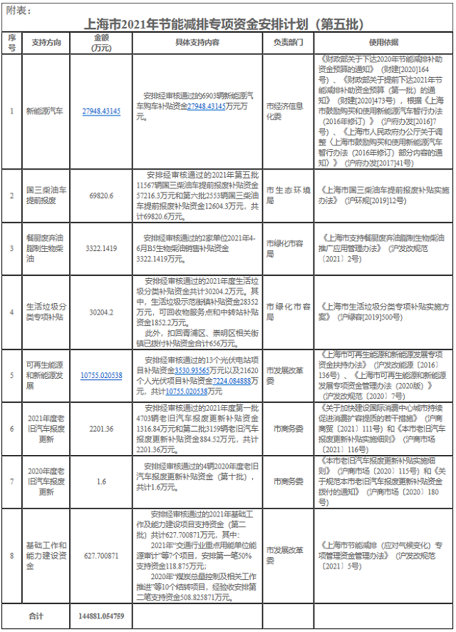 關(guān)于下達本市2021年節(jié)能減排專項資金安排計劃(第五批)的通知 市經(jīng)濟信息化委,市生態(tài)環(huán)境局,市綠化市容局,市商務(wù)委: 你們報來的資金使用計劃申請函(滬經(jīng)信制〔2021〕 651號、滬環(huán)保函〔2021〕65號、114號、滬綠容〔2021〕265號、266號、267號、滬商市場〔2021〕221號、2...