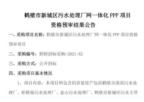 近日,中國水網(wǎng)從E20標(biāo)訊系統(tǒng)E標(biāo)通獲悉,鶴壁市新城區(qū)污水處理廠網(wǎng)一體化PPP項(xiàng)目正式發(fā)布資格預(yù)審結(jié)果公告。中節(jié)能國禎環(huán)??萍脊煞萦邢薰?、城發(fā)環(huán)境股份有限公司(聯(lián)合體牽頭人)與城發(fā)水務(wù)有限公司(聯(lián)合體成員)、深圳市環(huán)水投資集團(tuán)有限公司,通過初步資格預(yù)審。項(xiàng)目總投資61,239.26萬元,計(jì)劃合作期...
