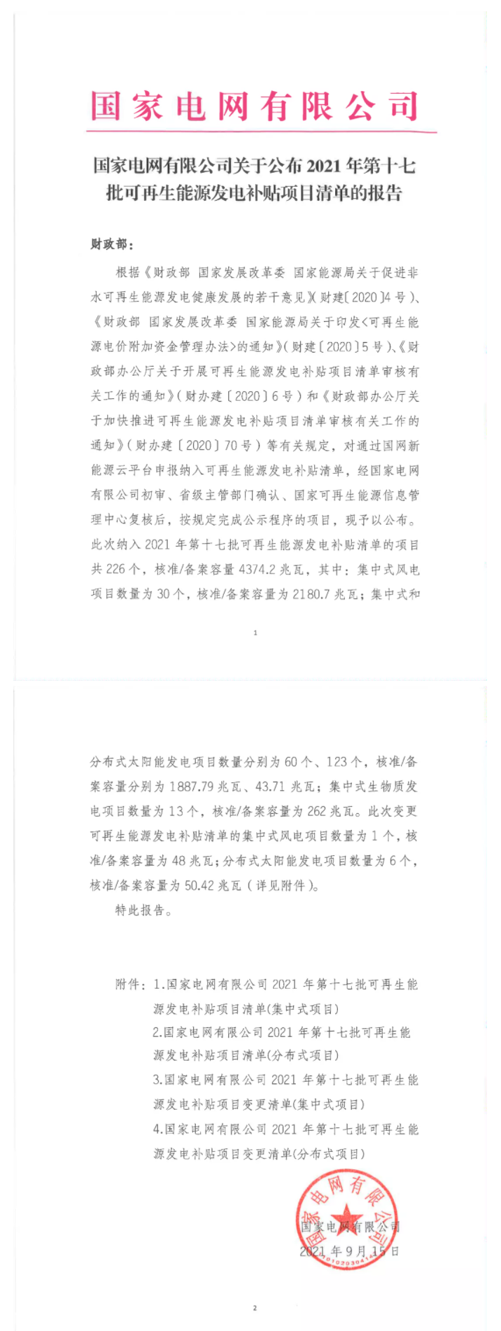 關(guān)于公布2021年第十七批可再生能源發(fā)電補(bǔ)貼項目清單的公告 根據(jù)《財政部 國家發(fā)展改革委 國家能源局關(guān)于促進(jìn)非水可再生能源發(fā)電健康發(fā)展的若干意見》(財建〔2020〕4號)、《財政部 國家發(fā)展改革委 國家能源局關(guān)于印發(fā)<可再生能源電價附加資金管理辦法>的通知》(財建〔2020〕5號)、《財...