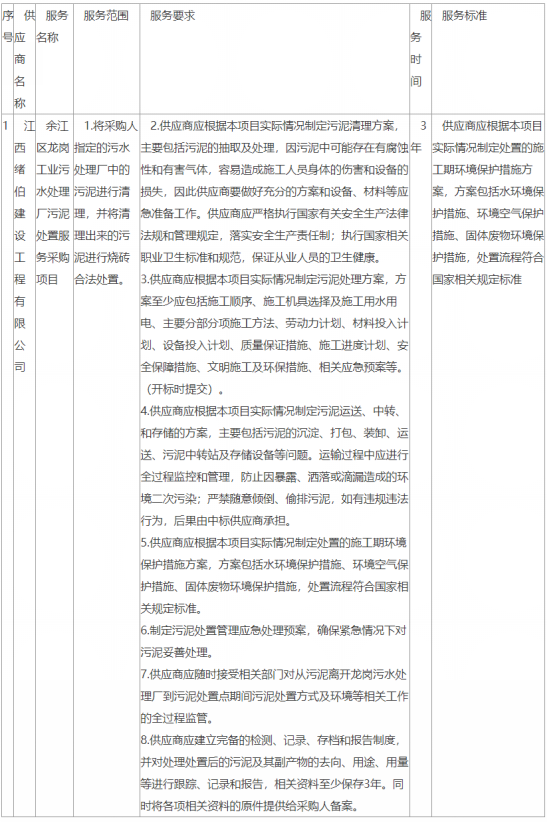 一、項(xiàng)目編號(hào):JXHD-2021-YT011(招標(biāo)文件編號(hào):JXHD-2021-011) 二、項(xiàng)目名稱:余江區(qū)龍崗工業(yè)污水處理廠污泥處置服務(wù)采購項(xiàng)目 三、中標(biāo)(成交)信息 供應(yīng)商名稱:江西緒伯建設(shè)工程有限公司 供應(yīng)商地址:江西省南昌市灣里區(qū)國家森林公園 中標(biāo)(成交)金額:109.5000000(萬元...
