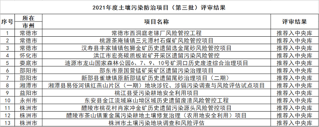 湖南省生態(tài)環(huán)境廳關(guān)于2021年度土壤污染防治項(xiàng)目(第三批)、地下水污染防治項(xiàng)目(第二批)評(píng)審結(jié)果的公示 根據(jù)《土壤污染防治專項(xiàng)資金管理辦法》、《關(guān)于印發(fā)<中央生態(tài)環(huán)境資金項(xiàng)目?jī)?chǔ)備庫入庫指南>的通知》、《湖南省省級(jí)財(cái)政專項(xiàng)資金公開辦法(試行)》等有關(guān)要求,經(jīng)項(xiàng)目單位申請(qǐng)、市級(jí)環(huán)保部門審查、...