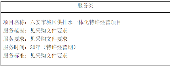 六安市城區(qū)供排水一體化特許經(jīng)營項(xiàng)目成交結(jié)果公告 一、項(xiàng)目編號(hào):20210285 二、項(xiàng)目名稱:六安市城區(qū)供排水一體化特許經(jīng)營項(xiàng)目 三、成交信息: 1、成交金額:政府付費(fèi)凈現(xiàn)值278122.09萬元。 2、成交單位信息: 聯(lián)合體牽頭單位 供應(yīng)商名稱:長(zhǎng)江生態(tài)環(huán)保集團(tuán)有限公司 供應(yīng)商地址:武漢市江岸區(qū)六...