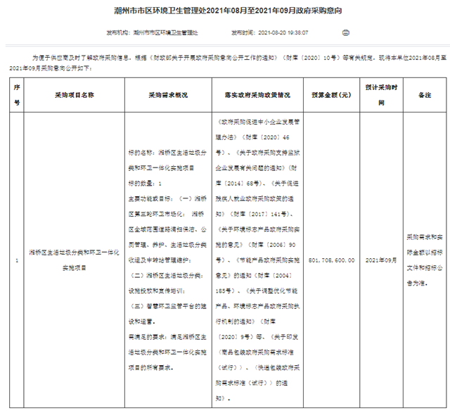 近日,中國固廢網(wǎng)從E20標(biāo)訊系統(tǒng)E標(biāo)通獲悉,廣東省潮州市將于9月份公開采購兩個環(huán)衛(wèi)項目,總投資超過10億!兩項目分別為湘橋區(qū)生活垃圾分類和環(huán)衛(wèi)一體化實施項目和楓溪區(qū)生活垃圾分類和環(huán)衛(wèi)一體化實施項目,預(yù)算金額分別為80170.86萬元和27852.86萬元。 項目:湘橋區(qū)生活垃圾分類和環(huán)衛(wèi)一體化實施項...