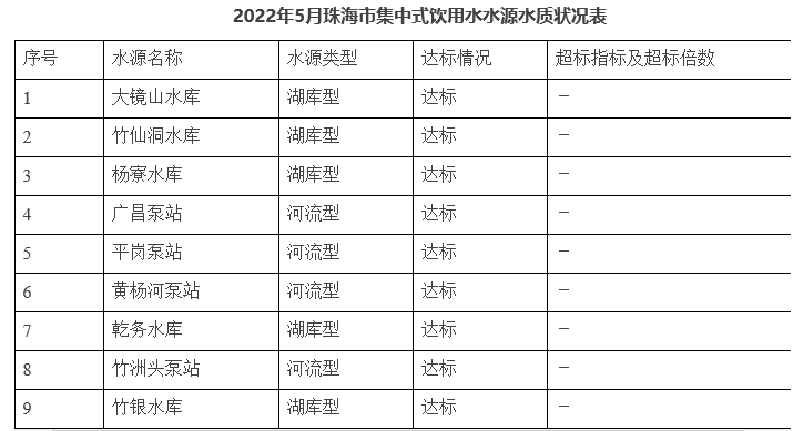 近日,珠海市生態(tài)環(huán)境局發(fā)布珠海市2022年5月集中式生活飲用水水源水質(zhì)狀況報(bào)告,監(jiān)測(cè)的9個(gè)主要集中式生活飲用水水源水質(zhì)均達(dá)標(biāo),達(dá)標(biāo)率為100%。詳情如下: 一、監(jiān)測(cè)情況 2022年,珠海市主要集中式生活飲用水水源共有9個(gè)(河流型4個(gè),湖庫(kù)型5個(gè)),分別為:廣昌泵站、平崗泵站、黃楊河泵站、竹洲頭泵站、...