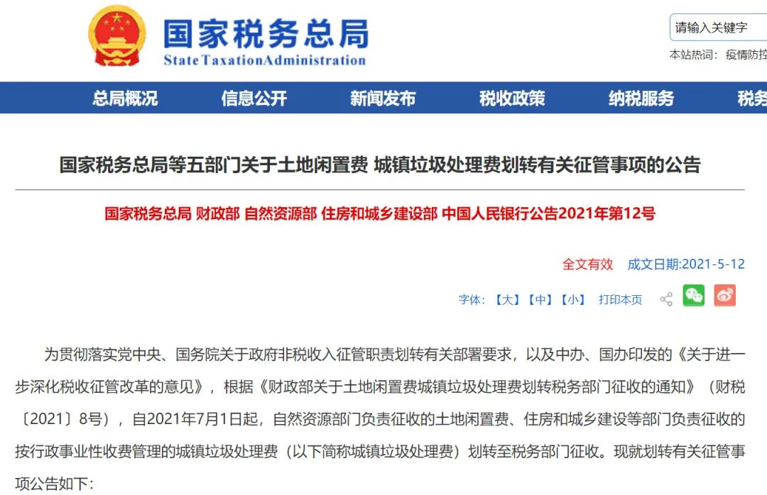 文章導(dǎo)讀5月12日,國(guó)家稅務(wù)總局、財(cái)政部、自然資源部、住建部、中國(guó)人民銀行五部門聯(lián)合發(fā)布《關(guān)于土地閑置費(fèi)城鎮(zhèn)垃圾處理費(fèi)劃轉(zhuǎn)有關(guān)征管事項(xiàng)的公告》(下稱《公告》),宣布自2021年7月1日起,住建部等部門負(fù)責(zé)征收的按行政事業(yè)性收費(fèi)管理的城鎮(zhèn)垃圾處理費(fèi)劃轉(zhuǎn)至稅務(wù)部門征收。017月1日起垃圾處理費(fèi)轉(zhuǎn)由稅務(wù)部...