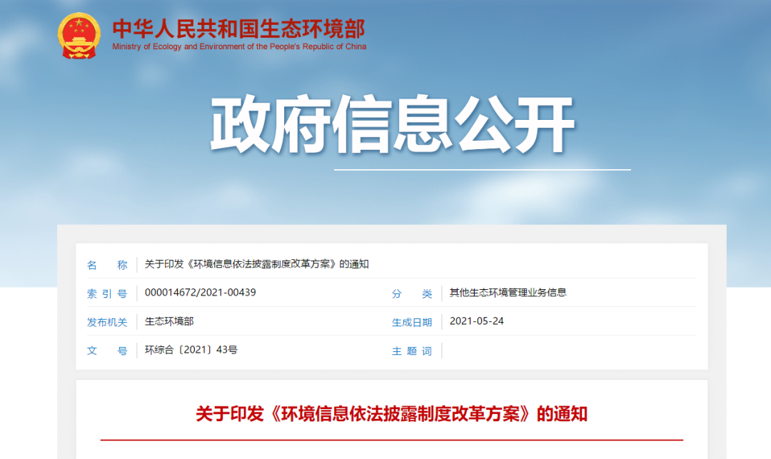 文章導(dǎo)讀生態(tài)環(huán)境部關(guān)于印發(fā)《環(huán)境信息依法披露制度改革方案》的通知。關(guān)于印發(fā)《環(huán)境信息依法披露制度改革方案》的通知各省、自治區(qū)、直轄市人民政府,中央和國(guó)家機(jī)關(guān)有關(guān)部門和單位: 《環(huán)境信息依法披露制度改革方案》已經(jīng)中央全面深化改革委員會(huì)會(huì)議審議通過(guò)。現(xiàn)印發(fā)給你們,請(qǐng)結(jié)合實(shí)際認(rèn)真貫徹落實(shí)。 生態(tài)環(huán)境部 2...