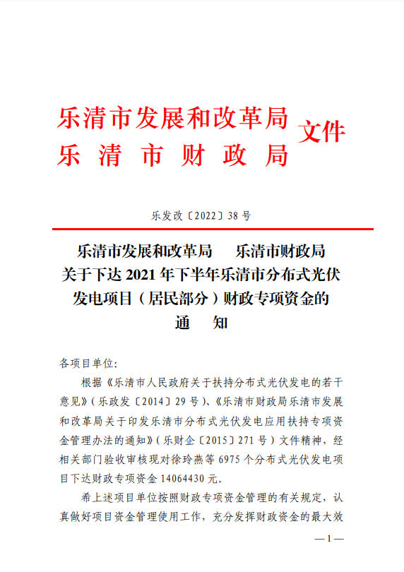 近日,浙江省樂清市發(fā)展和改革局發(fā)布《關(guān)于下達(dá)2021年下半年樂清市分布式光伏發(fā)電項(xiàng)目(居民部分)財(cái)政專項(xiàng)資金的通知》。詳情如下: 各項(xiàng)目單位: 根據(jù)《樂清市人民政府關(guān)于扶持分布式光伏發(fā)電的若干意見》(樂政發(fā)〔2014〕29號(hào))、《樂清市財(cái)政局樂清市發(fā)展和改革局關(guān)于印發(fā)樂清市分布式光伏發(fā)電應(yīng)用扶持專項(xiàng)...