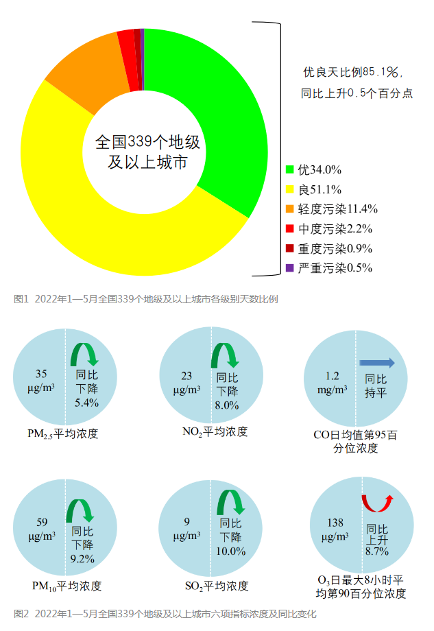 生態(tài)環(huán)境部今日向媒體通報(bào)了2022年5月和1—5月全國環(huán)境空氣質(zhì)量狀況。 環(huán)境空氣總體情況 2022年5月,全國339個(gè)地級(jí)及以上城市平均空氣質(zhì)量優(yōu)良天數(shù)比例為85.2%,同比下降2.6個(gè)百分點(diǎn);PM2.5平均濃度為22微克/立方米,同比持平;PM10平均濃度為45微克/立方米,同比下降...