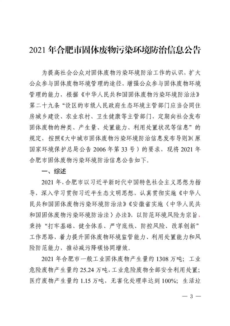 根據(jù)《大中城市固體廢物污染環(huán)境防治信息發(fā)布導則》(原國家環(huán)境保護總局公告2006年第33號)要求,日前,合肥市生態(tài)環(huán)境局向社會公開發(fā)布2021年合肥市固體廢物污染環(huán)境防治信息公告,提高公眾對固體廢物污染環(huán)境防治工作的認識,擴大公眾參與固體廢物環(huán)境管理的途徑。 強化危險廢物管理。2021年,全市工業(yè)危...