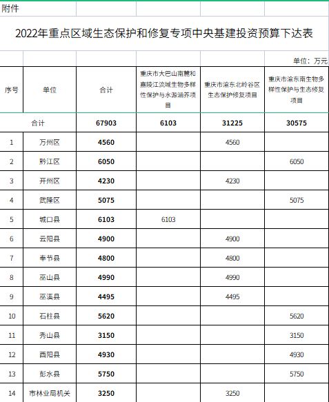 重慶市財(cái)政局關(guān)于下達(dá)2022年重點(diǎn)區(qū)域生態(tài)保護(hù)和修復(fù)專項(xiàng)中央基建投資預(yù)算的通知有關(guān)區(qū)縣(自治縣)財(cái)政局,市林業(yè)局: 根據(jù)《財(cái)政部關(guān)于下達(dá)2022年重點(diǎn)區(qū)域生態(tài)保護(hù)和修復(fù)專項(xiàng)(第一批)中央基建投資預(yù)算的通知》(財(cái)建〔2022〕127號(hào))、《財(cái)政部關(guān)于下達(dá)2022年重點(diǎn)區(qū)域生態(tài)保護(hù)和修復(fù)專項(xiàng)(第二批)中...