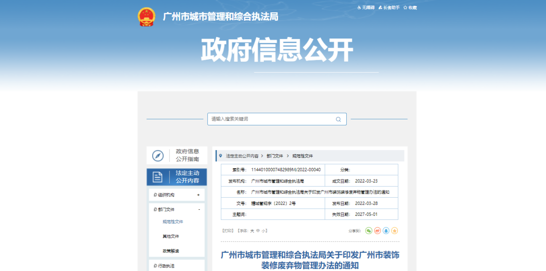 為推動裝飾裝修廢棄物規(guī)范化處置,維護(hù)城市管理秩序和市容環(huán)境衛(wèi)生,促進(jìn)裝飾裝修廢棄物綜合利用,2022年3月28日,廣州市城市管理和綜合執(zhí)法局發(fā)布了《廣州市裝飾裝修廢棄物管理辦法》。 《辦法》適用于居民住宅裝飾裝修工程以及投資額不超過100萬元(含100萬元)或者建筑面積不超過500平方米(含500平...