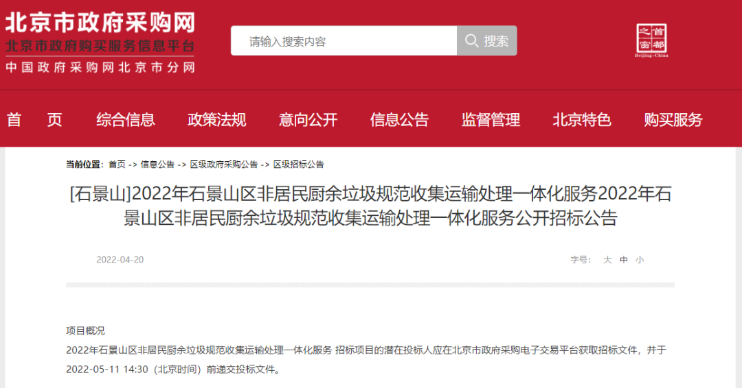 4月20日,北京市政府采購網(wǎng)發(fā)布2022年石景山區(qū)非居民廚余垃圾規(guī)范收集運(yùn)輸處理一體化服務(wù)項目的招標(biāo)公告,該項目預(yù)算金額2500萬元(不含供應(yīng)商向餐飲單位收取的相關(guān)費用)。項目最高限價收運(yùn)服務(wù)費487.29元/噸(含稅),處置服務(wù)費331.37元/噸(含稅),收、處合計達(dá)818.66元/噸,服務(wù)期限...