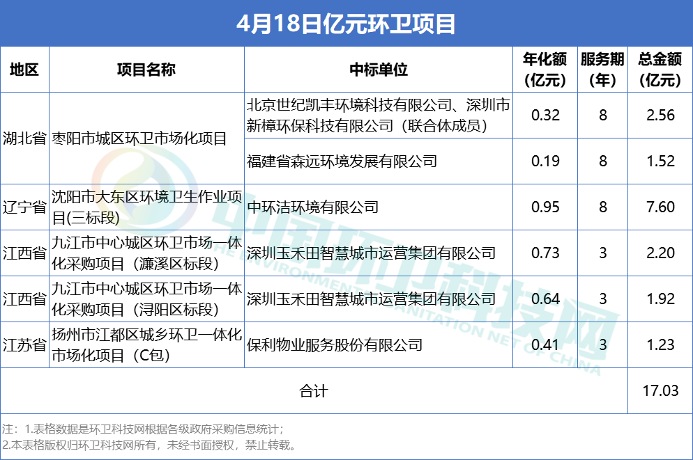 4月18日,有4個億元環(huán)衛(wèi)項目6個標(biāo)段在同日公布中標(biāo)結(jié)果,合計中標(biāo)金額達(dá)17.03億元,中標(biāo)單位包括中環(huán)潔、玉禾田、保利物業(yè)、世紀(jì)凱豐、新樟環(huán)保和森遠(yuǎn)環(huán)境。 沈陽市大東區(qū)環(huán)境衛(wèi)生作業(yè)項目(三標(biāo)段) 中標(biāo)單位:中環(huán)潔環(huán)境有限公司; 中標(biāo)金額:9501.4148萬元/年; 服務(wù)期限:5+3模式,實行考核...