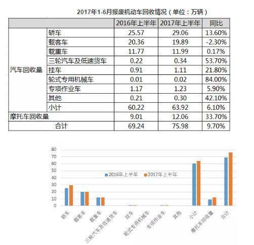 2017年上半年行業(yè)發(fā)展情況2017年上半年,我國(guó)回收拆解量較上年度同期有所上升。今年1-6月份,全國(guó)回收?qǐng)?bào)廢機(jī)動(dòng)車(chē)共計(jì)75.98萬(wàn)輛,與2016年上半年的69.24萬(wàn)輛相比,同比增長(zhǎng)9.7%。數(shù)據(jù)來(lái)源:中國(guó)物資再生協(xié)會(huì)其中,回收?qǐng)?bào)廢汽車(chē)63.92萬(wàn)輛,同比增長(zhǎng)6.1%;回收?qǐng)?bào)廢摩托車(chē)12.06萬(wàn)輛...