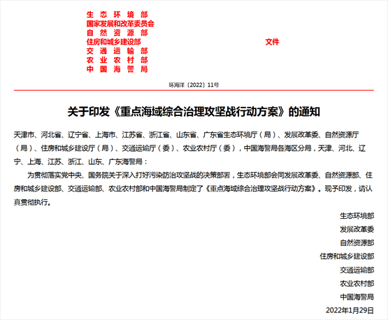 近日,生態(tài)環(huán)境部、發(fā)展改革委、自然資源部、住房和城鄉(xiāng)建設(shè)部、交通運輸部、農(nóng)業(yè)農(nóng)村部和中國海警局聯(lián)合印發(fā)《重點海域綜合治理攻堅戰(zhàn)行動方案》(以下簡稱《行動方案》),對“十四五”時期渤海、長江口-杭州灣和珠江口鄰近海域等三大重點海域綜合治理攻堅行動的總體要求、主要目標(biāo)、重點任務(wù)和保障措施等作出了部署安排...