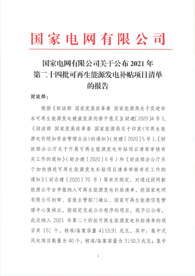 關(guān)于公布2021年第二十四批可再生能源發(fā)電補(bǔ)貼項(xiàng)目清單的公告 根據(jù)《財(cái)政部 國家發(fā)展改革委 國家能源局關(guān)于促進(jìn)非水可再生能源發(fā)電健康發(fā)展的若干意見》(財(cái)建〔2020〕4號(hào))、《財(cái)政部 國家發(fā)展改革委 國家能源局關(guān)于印發(fā)<可再生能源電價(jià)附加資金管理辦法>的通知》(財(cái)建〔2020〕5號(hào))、《...