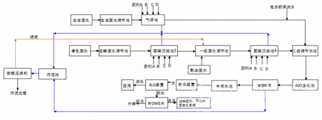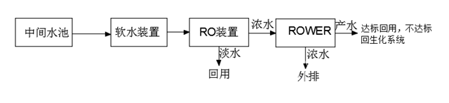 經(jīng)反滲透處理的濃水,利用離心泵把水打到ROWER膜堆中,在膜堆中通直流電源,利用膜的選擇透過性,使原水中的離子遷移到ROWER濃水中,達到除鹽的目的,ROWER產生的淡水若能滿足系統(tǒng)沖洗回用水的需要,則利用;否則進一步回到生化系統(tǒng)中,繼續(xù)進一步降低COD,從而進一步提高回用水的利用率。