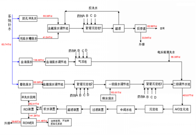 該工程設計按照氧化線處理水量10000噸/月,立式噴涂線處理水量3000噸/月,按每月30天,24小時連續(xù)運行設計整個系統(tǒng)。經(jīng)過生化系統(tǒng)處理的水,進回用水系統(tǒng),產生的濃水符合排放標準排入市政管網(wǎng)。