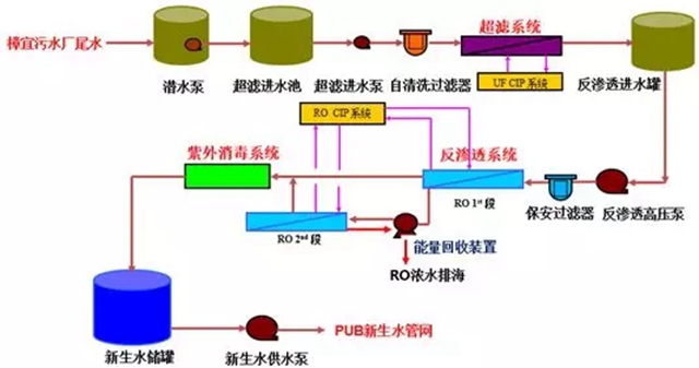 本項(xiàng)目采用了超濾、反滲透、UV殺菌三段工藝(工藝流程如圖2所示)。原水是樟宜污水廠二級(jí)生化處理出水,其主要污染物為懸浮顆粒物、有機(jī)污染物、溶解性無機(jī)物、細(xì)菌、病毒等。超濾工藝段主要目的是降低水的濁度,去除水中的懸浮顆粒物、大分子有機(jī)物和細(xì)菌等。反滲透工藝段采用過濾孔徑小于1納米的反滲透膜,去除各種小分子無機(jī)鹽、有機(jī)物和病毒。UV殺菌段進(jìn)一步殺滅水中殘留的致病菌和病毒,最終成品水進(jìn)入新生水儲(chǔ)罐,由新加坡公用事業(yè)局進(jìn)行統(tǒng)一調(diào)配。反滲透系統(tǒng)采用一級(jí)二段式,一段反滲透的濃水再經(jīng)過二段反滲透,進(jìn)一步回收淡水,在一段反滲透和二段反滲透之間增加能量回收裝置,達(dá)到節(jié)能目的。