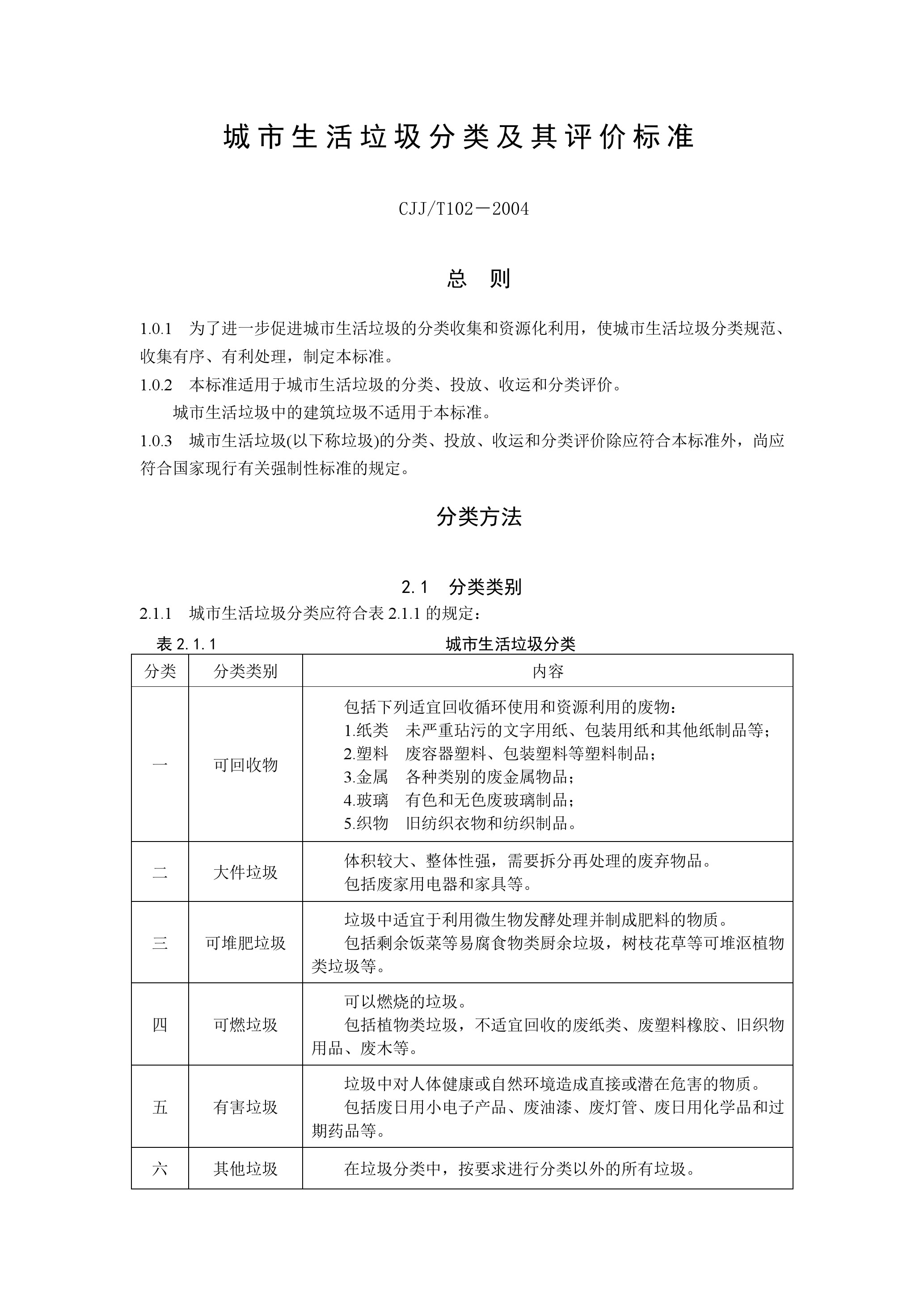 城市生活垃圾分類及其評(píng)價(jià)標(biāo)準(zhǔn)(CJJ/T102-2004)