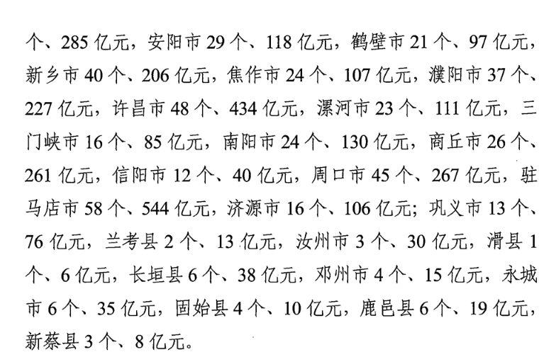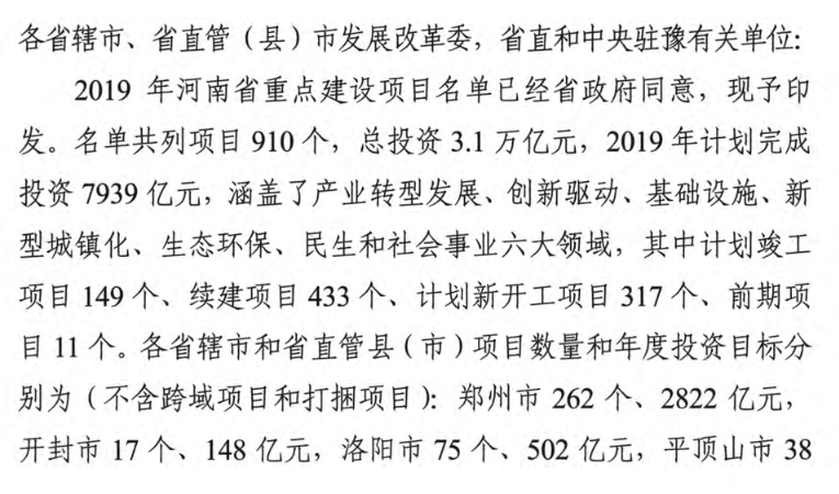 2月11日,河南省發(fā)改委發(fā)布《關(guān)于印發(fā)2019年河南省重點(diǎn)建設(shè)項(xiàng)目名單的通知》。名單共列項(xiàng)目910個(gè),總投資3.1萬(wàn)億元,2019年計(jì)劃完成投資7939億元,涵蓋了產(chǎn)業(yè)轉(zhuǎn)型發(fā)展、創(chuàng)新驅(qū)動(dòng)、基礎(chǔ)設(shè)施、新型城鎮(zhèn)化、生態(tài)環(huán)保、民生和社會(huì)事業(yè)六大領(lǐng)域18個(gè)行業(yè)。其中計(jì)劃竣工項(xiàng)目149個(gè)、續(xù)建項(xiàng)目433個(gè)、計(jì)劃新開(kāi)工項(xiàng)目317個(gè)、前期項(xiàng)目11個(gè)。