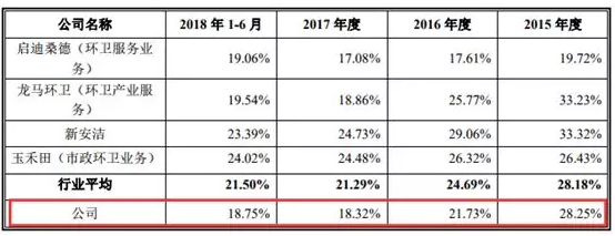 報告期內,僑銀環(huán)保毛利率分別為28.22%、21.72%、18.28%、18.75%,呈連續(xù)下降的態(tài)勢,雖然行業(yè)的毛利率也在下降,但下降幅度沒有僑銀環(huán)保大。