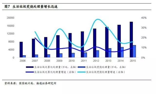 目前衛(wèi)生填埋處理占主導(dǎo)地位,長期看焚燒處理優(yōu)勢明顯、增速較快。常見的垃圾無害化處理方式有衛(wèi)生填埋、焚燒和高溫堆肥。其中,我國垃圾焚燒處理量占比從2006年的14.45%上升到2015年的34.28%,2015年焚燒處理量為6176萬噸,處理能力為21.9萬噸/日(約8000萬噸/年);衛(wèi)生填埋占比從2006年的81.4%下降到2015年的63.75%,2015年處理量為11483萬噸,處理能力為34.4萬噸/日(約12600萬噸/年),而近年高溫堆肥處理量極少,2015年僅為354萬噸。垃圾焚燒與填埋法相比,經(jīng)濟效益和環(huán)境保護程度更高:①減量縮容:在垃圾經(jīng)過焚燒后,一般可減重80%,減容90%以上,節(jié)約大量的土地資源;②資源再利用:按熱值比較,每噸生活垃圾約相當(dāng)于0.2-0.25噸標(biāo)準(zhǔn)煤,垃圾焚燒發(fā)電的資源綜合利用效益相當(dāng)可觀;③污染弱:垃圾焚燒主要產(chǎn)生的氣體為二氧化碳。因而垃圾焚燒成為近年來國家推崇的無害化處理方式,在垃圾無害化處理中的占比逐年上升。