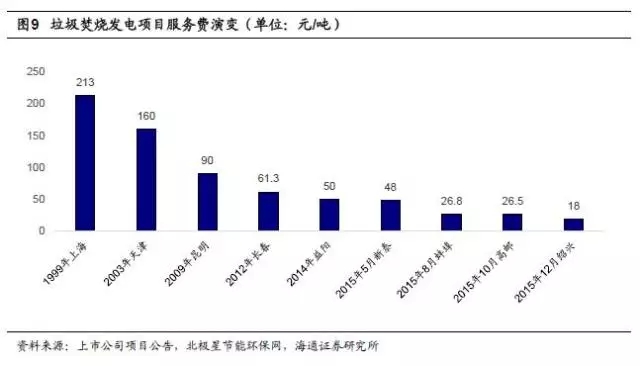 行業(yè)競爭加劇,處理費下行。在市場參與者逐漸增多和行業(yè)競爭逐步加劇的背景下,近年新建的垃圾焚燒項目處理費呈下降趨勢。2015年以來,一些企業(yè)為了搶占市場而壓低價格,低價中標(biāo)項目涌現(xiàn):2015年山東新泰項目中標(biāo)價48元/噸,安徽蚌埠項目中標(biāo)價26.8元/噸,江蘇高郵項目中標(biāo)價26.5元/噸,浙江紹興項目中標(biāo)價更是降至18元,擾亂市場正常秩序。除去少數(shù)惡意壓低價格的項目,根據(jù)中國經(jīng)濟導(dǎo)報統(tǒng)計,近年來垃圾焚燒特許經(jīng)營項目處理費每噸平均在60~80元,整體呈現(xiàn)小幅下降的趨勢。
