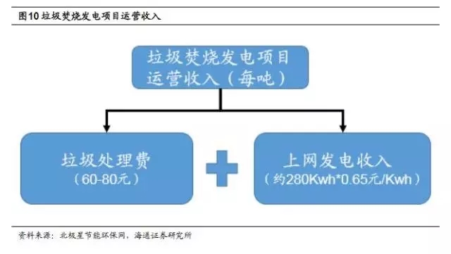 BOT模式下,垃圾焚燒項目的收入主要來自建設(shè)階段的工程收入和運營階段的運營收入。垃圾焚燒發(fā)電項目運營階段收入主要為垃圾處理費(政府補貼)以及上網(wǎng)發(fā)電收入。不同項目的垃圾處理費價格差異較大,大致在50-150元/噸的區(qū)間里,目前大部分項目的平均水平在60-80元/噸。根據(jù)2012年4月發(fā)布的《國家發(fā)展改革委關(guān)于完善垃圾焚燒發(fā)電價格政策的通知》,每噸生活垃圾折算上網(wǎng)電量為280千瓦時,執(zhí)行全國統(tǒng)一垃圾發(fā)電標(biāo)桿電價每千瓦時0.65元(含稅,增值稅即征即退);超過部分電量執(zhí)行當(dāng)?shù)赝惾济喊l(fā)電機組上網(wǎng)電價。
