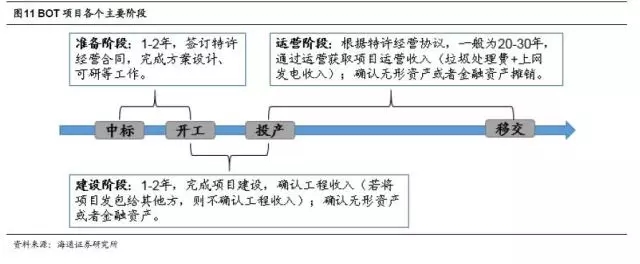 對項目公司而言,項目中標(biāo)后,主要會經(jīng)歷三個階段,分別是準(zhǔn)備階段(一般為1-2年,完成項目的前期準(zhǔn)備工作,簽訂特許經(jīng)營合同,完成環(huán)評、可研報告等工作)、建設(shè)階段(一般為1-2年,完成項目建設(shè),確認工程收入,若項目外包給其他方,則不確認)和運營階段(在特許經(jīng)營期內(nèi),負責(zé)項目的運營,獲取垃圾處理費補貼和上網(wǎng)發(fā)電收入),特許經(jīng)營期到期之后,項目無償移交給政府。