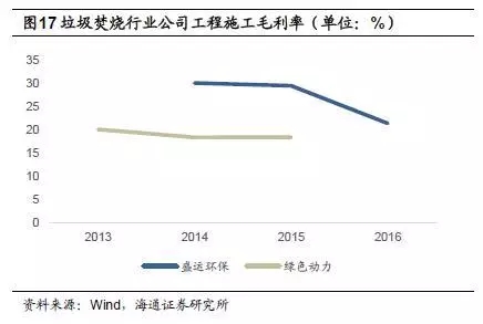 偉明環(huán)保項目運營毛利率較高,2015年為65.9%,2016年小幅下降,為62.5%;中國天楹運營業(yè)務(wù)毛利率也相對較高,2016年為49.2%,但相較于2014年的65.1%下滑近16個百分點;綠色動力2015年毛利率為49.0%;盛運環(huán)保2015年運營業(yè)務(wù)毛利率為45.3%,2016年為18.0%。