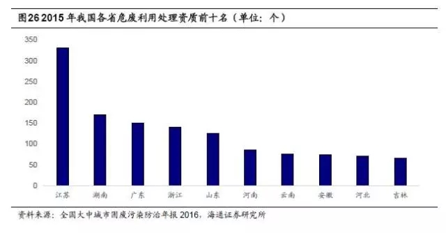 我國危廢綜合利用與處置行業(yè)格局分散,市場集中度較低。2015年全國危廢許可證(含醫(yī)療危廢)數(shù)量為2034個,較前一年增加113個,其中江蘇省頒發(fā)的危廢許可證數(shù)量為327個,數(shù)量上排名第一,湖南、廣東分列二、三位,數(shù)量在150個左右,浙江、山東也超過100個。截止到2015年,全國危險廢物經(jīng)營單位核準(zhǔn)經(jīng)營規(guī)模達到5263萬噸/年,其中核準(zhǔn)利用規(guī)模為4155.1萬噸/年,核準(zhǔn)處置規(guī)模為982.4萬噸/年,平均每個許可證僅對應(yīng)2.59萬噸/年的利用和處置能力。根據(jù)2008年環(huán)保部公布的危廢處置名單,當(dāng)時全國1500多家具有危廢處理資質(zhì)的企業(yè)中,處理能力達到1000噸/日的企業(yè)僅占0.3%,目前行業(yè)格局沒有太大變化。