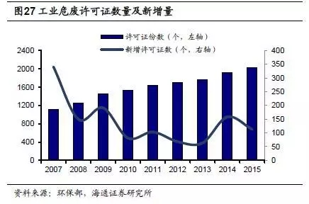 我國政府對危廢處理行業(yè)實行許可證制度。這一方面能夠保證從事危廢處理業(yè)務(wù)的公司基本擁有較強的技術(shù)實力和項目經(jīng)驗,從而保障危廢無害化處理的效率,減少處理不當(dāng)造成的二次污染;另一方面,實行許可證制度會限制新進企業(yè)數(shù)量,限制全國危廢綜合利用和處置總量。