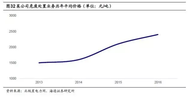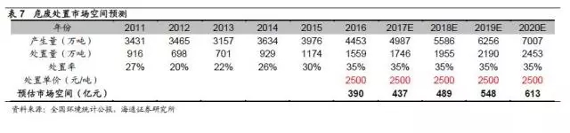 危廢處置價格穩(wěn)步上升,市場空間巨大。從核準(zhǔn)經(jīng)營規(guī)???,危廢處置產(chǎn)能緊缺,2015年核準(zhǔn)處置規(guī)模僅982.4萬噸/年。近年來,危廢處置價格呈現(xiàn)穩(wěn)步上升趨勢。以行業(yè)內(nèi)某領(lǐng)先企業(yè)為例,2013年,其危廢處置業(yè)務(wù)平均價格為1500元/噸左右,2016年則上升至2500元/噸左右。以全國環(huán)境統(tǒng)計公報數(shù)據(jù)為基礎(chǔ),假設(shè)未來幾年危廢產(chǎn)生量保持過去十年復(fù)合增長率12%的增速,保守估計處置率為35%,單位處置成本為2500元/噸,則預(yù)計2020年危廢處置市場為613億元,2017-2020處置市場空間總計2086億元??紤]到還有大量的危廢沒有進入國家統(tǒng)計口徑,若將這些量考慮在內(nèi),市場空間還將提升2-3倍。