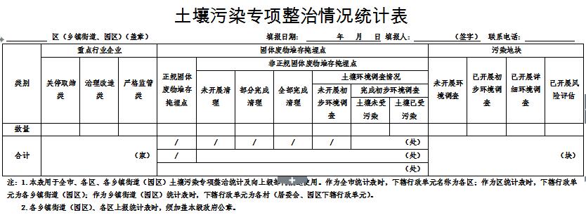 (三)嚴(yán)格執(zhí)行登記制度。各區(qū)要按照方案要求,按時完成各項(xiàng)工作,于6月30日前向市環(huán)保局報(bào)送土壤質(zhì)量與修復(fù)規(guī)劃;7月15日前向市環(huán)保局報(bào)送各類登記表(附件1);11月30日前向市環(huán)保局報(bào)送各類花名冊(附件2)和土壤污染專項(xiàng)整治情況統(tǒng)計(jì)表(附件3)。同時向市市容園林委報(bào)送涉及城鎮(zhèn)生活垃圾相關(guān)內(nèi)容,向市農(nóng)委報(bào)送涉及村莊內(nèi)生活垃圾相關(guān)內(nèi)容。