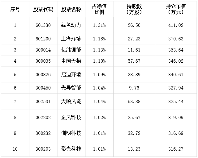 該基金的10大重倉持股包括綠色動(dòng)力、上海環(huán)境、啟迪環(huán)境、中國天楹、聚光科技等行業(yè)龍頭,凈值占比、持股數(shù)量以及持倉市值,見下表: