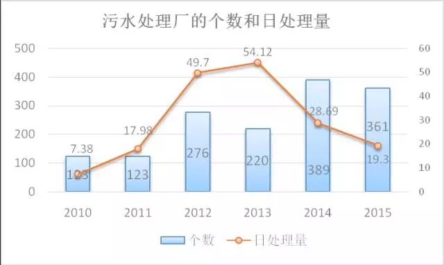 2010-2015進(jìn)行生活污水處理的行政村統(tǒng)計(jì)圖