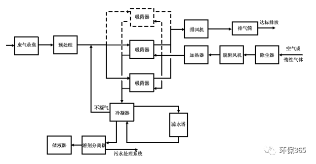 當(dāng)廢氣中的有機(jī)物具有回收價(jià)值時(shí),可根據(jù)情況選擇采用水蒸氣再生、熱氣流(空氣或惰性氣體)再生或降壓解吸再生工藝。脫附后產(chǎn)生的高濃度氣體可根據(jù)情況選擇采用降溫冷凝或液體吸收工藝對有機(jī)物進(jìn)行回收。