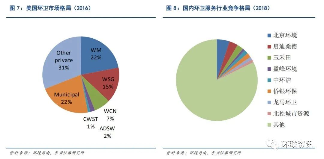 而國內(nèi)環(huán)衛(wèi)服務(wù)公司以清掃為主,從事收集轉(zhuǎn)運、也必須以清掃為入口才能切入,從而導(dǎo)致中國的環(huán)衛(wèi)市場較為分散。從商業(yè)模式來看,表現(xiàn)為美國的環(huán)衛(wèi)服務(wù)企業(yè)更為資本密集型,而國內(nèi)的環(huán)衛(wèi)服務(wù)企業(yè)為勞動密集型企業(yè)。