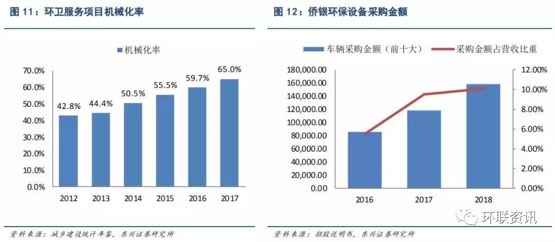 環(huán)衛(wèi)機械化率提升。近幾年我國市政環(huán)衛(wèi)機械化進程較快,上市公司的機械設(shè)備采購金額占比明顯提升,據(jù)披露,玉禾田機械設(shè)備采購金額 2017 年和 2018 年的增幅分別達到 108.86%、54.99%,分別占營業(yè)收入12.18%、14.42%;僑銀環(huán)保 2017 年和 2018 年的增幅分別達到 137.73%、40.47%,分別占營業(yè)收入 9.51%、10.06%。此外,國務(wù)院住建部城鄉(xiāng)建設(shè)統(tǒng)計公報顯示,機械化清掃率從 2012 年的 42.8%提升到 2017 年的65.0%。由于目前機械化數(shù)據(jù)統(tǒng)計標準較為寬松,較多機械化清掃后的面積仍需通過人工再清理,雖然數(shù)據(jù)提升較快,但我國目前的機械化程度仍處于較低水平。