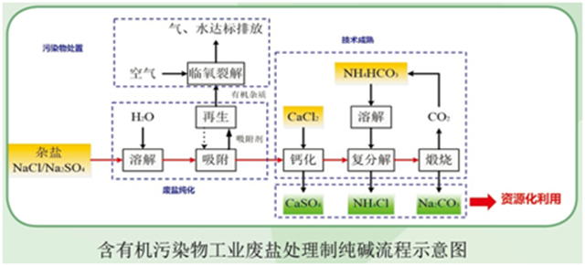 利用吸附-脫附技術富集工業(yè)廢鹽溶液中的有機污染物,再通過臨氧裂解技術實現達標排放,凈化后的鹽溶液進入制堿工藝,制堿工藝技術成熟,從而實現工業(yè)廢鹽的資源化利用。