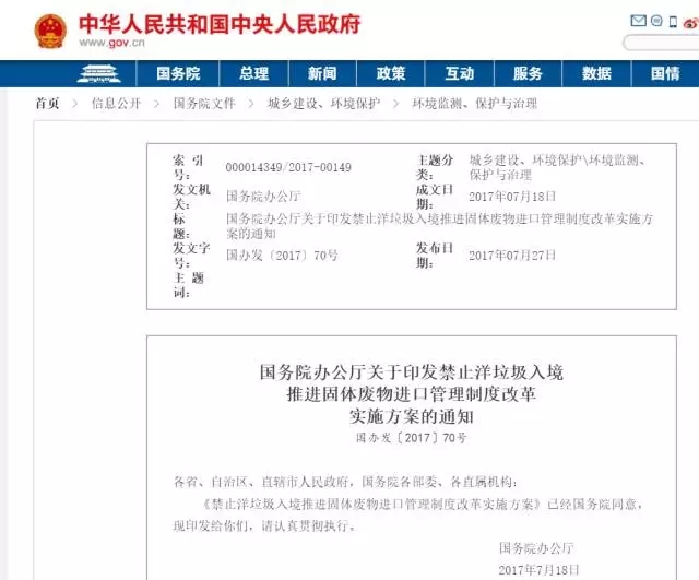 7月27日,國務院辦公廳正式發(fā)布禁止洋垃圾入境推進固體廢物進口管理制度改革實施方案。明確2017年年底前,全面禁止進口環(huán)境危害大、群眾反映強烈的固體廢物;2019年年底前,逐步停止進口國內(nèi)資源可以替代的固體廢物。