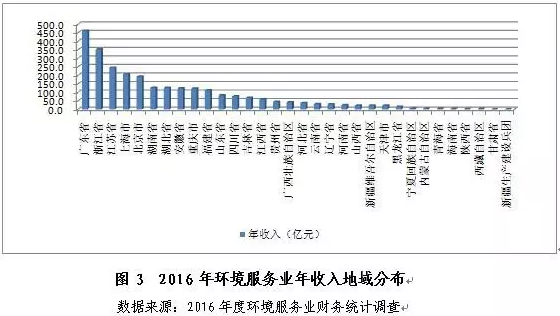 2016年,環(huán)境服務(wù)業(yè)在全國各地均有分布,且具有較高的區(qū)域集中度。54%以上的年收入來自于排名前5的地區(qū),僅2%來自排名最后的10個?。ㄗ灾螀^(qū)、直轄市),分布格局與2015年基本一致。廣東省、浙江省、江蘇省、上海市和北京市以其分別作為珠三角、長三角的核心地區(qū)以及首都的地緣優(yōu)勢,經(jīng)濟(jì)基礎(chǔ)雄厚、體制環(huán)境優(yōu)渥、公眾環(huán)境意識較高、環(huán)境管理要求相對嚴(yán)格,成為全國環(huán)境服務(wù)業(yè)年收入的主要貢獻(xiàn)者。