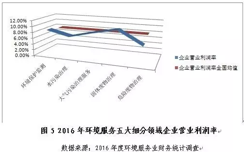 從盈利情況看,環(huán)境保護(hù)監(jiān)測、水污染治理、大氣污染治理、固體廢物治理和危險廢物治理五大細(xì)分領(lǐng)域中,僅固體廢物治理和危險廢物治理領(lǐng)域的2016年營業(yè)利潤率較2015年有所提高,固體廢物治理領(lǐng)域以10.4%的營業(yè)利潤率成為五領(lǐng)域中盈利能力最高的細(xì)分行業(yè),危險廢物治理領(lǐng)域營業(yè)利潤率同比增幅最高,約94.2%;環(huán)境保護(hù)監(jiān)測、大氣污染治理和水污染治理三領(lǐng)域的2016年營業(yè)利潤率同比分別下滑18.9%、11.3%和9.0%。
