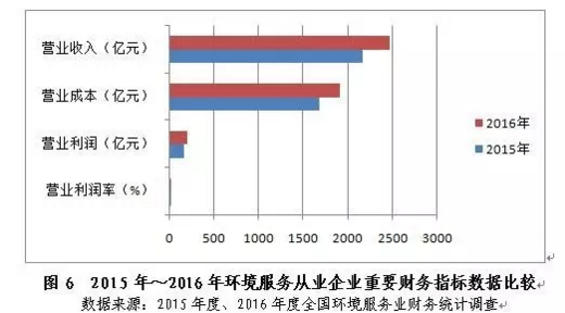 環(huán)境服務(wù)從業(yè)企業(yè)(以執(zhí)行的會計制度劃分)營業(yè)收入以高于行業(yè)整體年均漲幅0.4個百分點(diǎn)的增速實(shí)現(xiàn)收入的持續(xù)拉升,占年收入總額的比重由2015年的92.4%小幅升至2016年的92.7%,2016年達(dá)2469.5億元,同比增長14.2%,實(shí)現(xiàn)營業(yè)利潤額194.2億元,同比上漲20.6%。由于勞動力成本、原材料價格、融資成本漲幅總體溫和,2016年企業(yè)營業(yè)成本同比增幅約13.6%,略低于營業(yè)收入同比增速,行業(yè)營業(yè)利潤率從2015年的7.4%小幅升至2016年的7.9%。